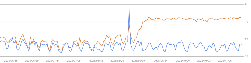 なので、このAI検索に「乗るしかない!このビッグウェーブに!!」とばかりに順位がとんでもなく跳ねました。(これは9月のGoogleスパムアップデート前後の影響ともいわれていますが、個人的には、AI検索の準備アップデートだったと思っています)