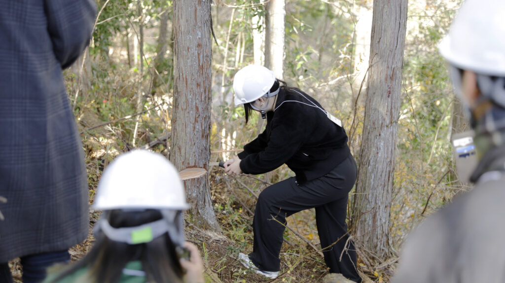 間伐体験では、実際のヒノキの木を伐採する体験からはじまります。