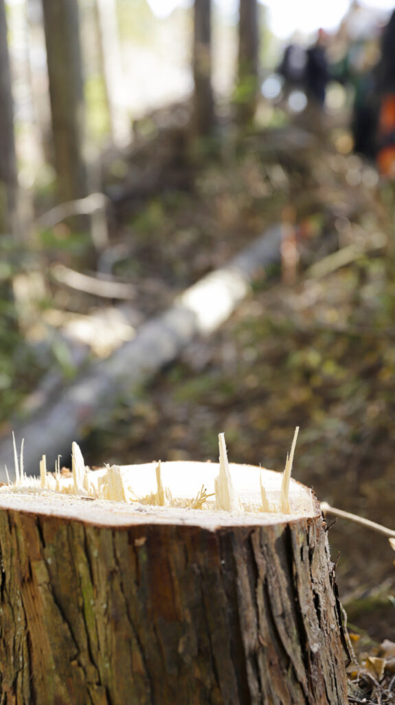 それでも、誰か一人が切るのではなく、全員が順番にノコギリを入れていき、最後は、協力いただいた林業スタッフがロープをかけ、「せーの」で全員が引き倒す。