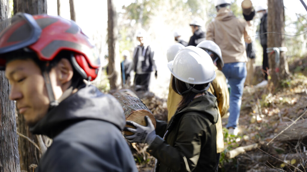 切り倒したヒノキは、手で持てる大きさに切り分け、バケツリレー方式で運びます。