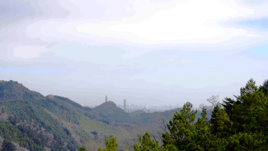 森の中の開けた場所からは、遠くに新宿のビル群やスカイツリーが、