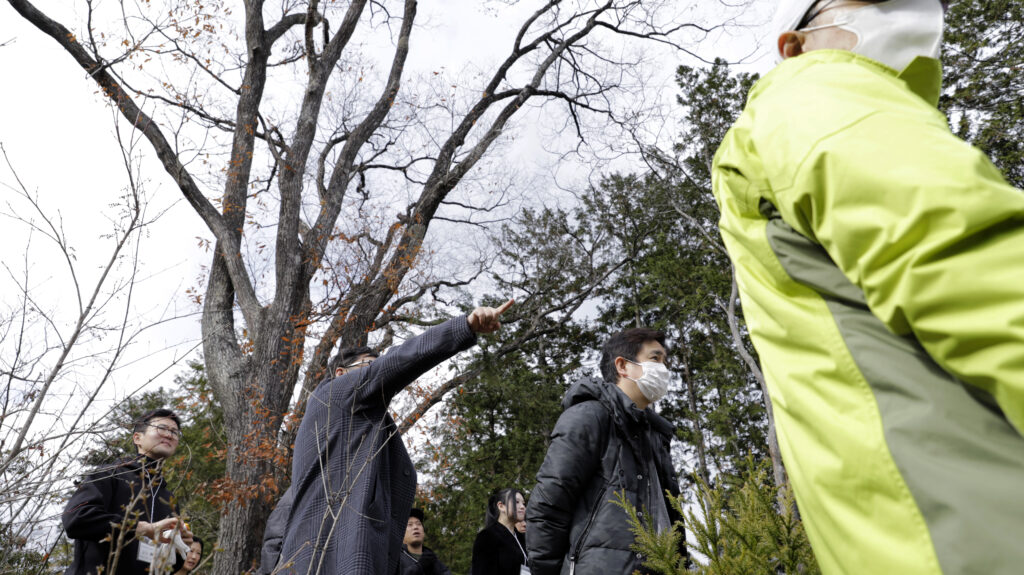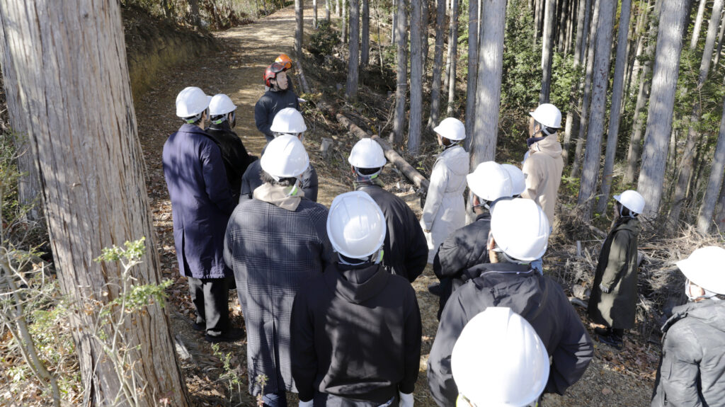 間伐体験のあとは、地域で林業会社の方が管理する森に入り、いま森で起きている問題についてのレクチャーが行われました。