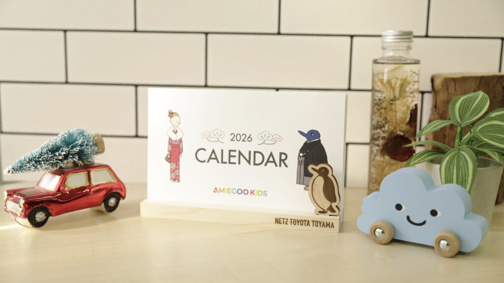 カレンダー本文には季節の豆知識が子ども向けに書かれており、土台にはアミーゴのチャームが付いているのがポイントです。