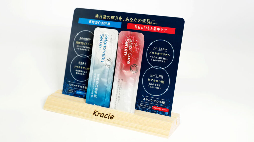 この木製什器をきっかけにして、クラシエホームプロダクツ様でOEM製造したホテル向けアメニティ用化粧品の展示什器にも木製の什器を採用していただきました。