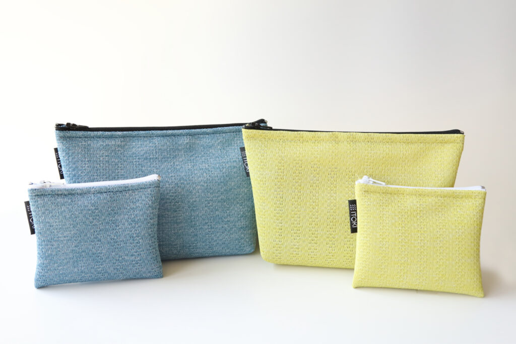 イトーキ様の椅子の座面、背もたれに用いる椅子の布などの張地。これは、椅子のデザインにあわせて大きな布地を型で切り取って使用するところ以外は廃棄材となっていました。この廃棄材を有効活用し、おしゃれなポーチにしています。