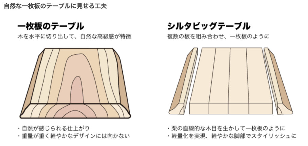 シルタでは、この一枚板のテーブルに見せながら繊細な脚部を実現するために様々な工夫がなされています。
