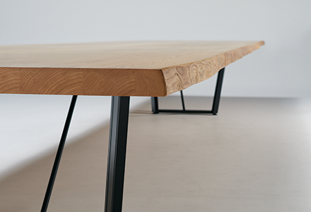 シルタでは、この一枚板のテーブルに見せながら繊細な脚部を実現するために様々な工夫がなされています。