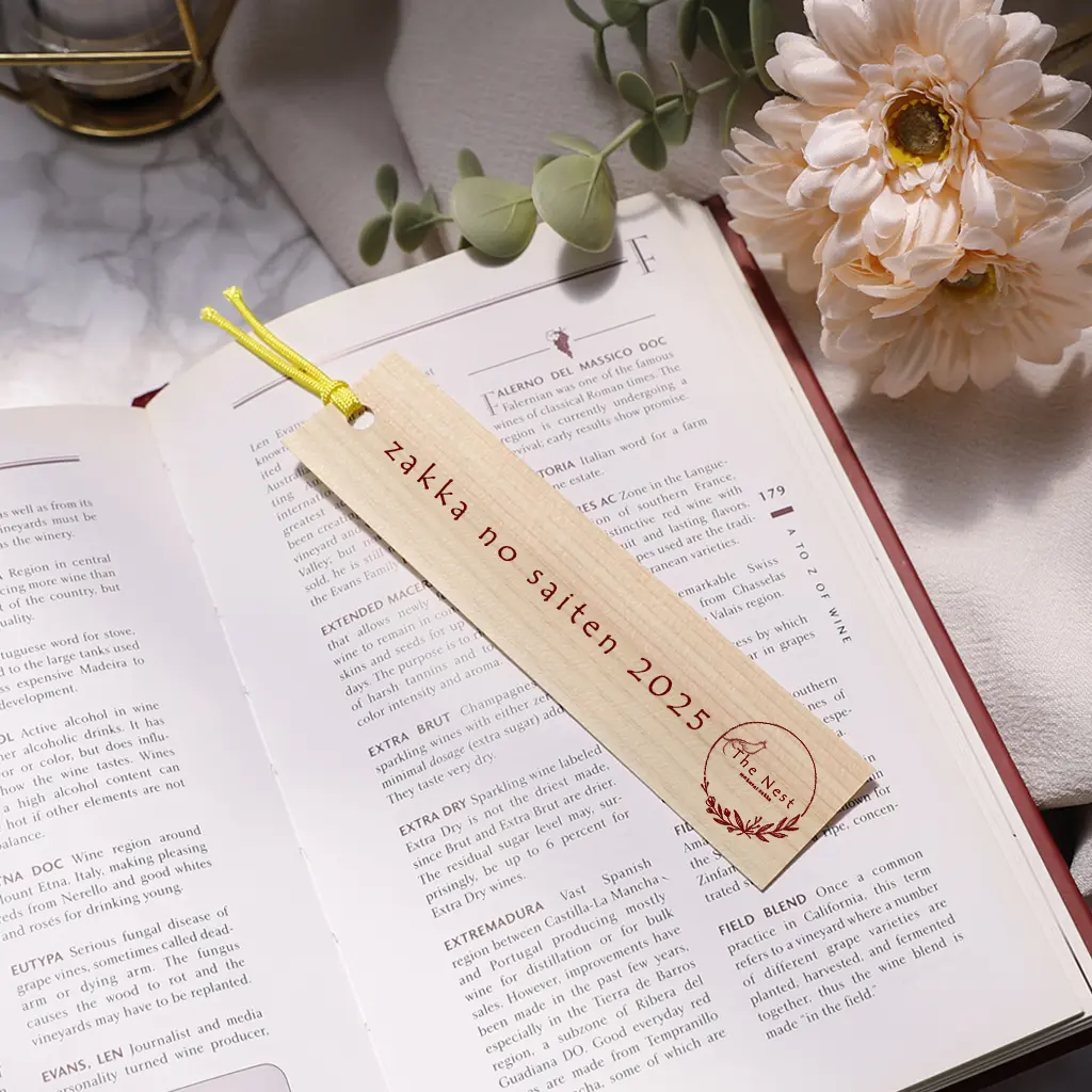 国産ヒノキ間伐材を紙のように薄く加工し、反れにくくなるよう工夫されているしおりです。
